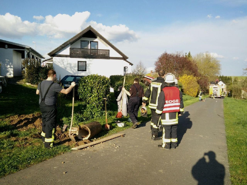 Noch während der Nachbesprechung zu unserem vorherigem Einsatz wurden wir von einer Bürgerin über einen Hund der in ein Betonnrohr eingeschlossen war informiert. Wir rückten sofort aus und waren wenig später vor Ort. Der Hund hatte einen Dachs bis in das Rohr gejagt. Er hielt an seiner Beute fest und kam nicht wieder raus. Wir öffneten auf halber Strecke das Rohr und kam auch so nicht an das Tier dran. Nach einiger Zeit kroch er zurück, so dass wir ihn dann fassen und befreien konnten.