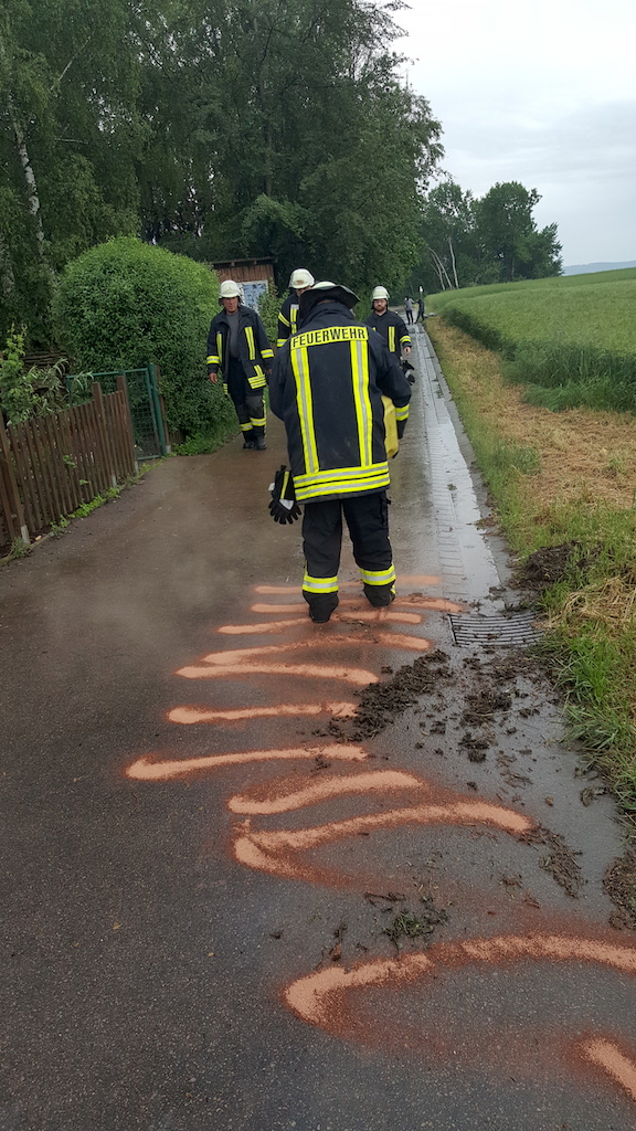 Nach Abschluss der EInsätze in Oelsberg wurde die Freiw. Feuerwehr nach Bogel alarmiert. Hier wurde Ölverschmutzungen auf dem Radweg gemeldet. Vor Ort war ebenfalls ein Kanaleinlauf verstopft und das Wasser hatte den Weg überschwemmt. Auf dem Radweg gab es mehrere Stellen mit Ölspuren, welche von uns mit Bindemittel abgestreut wurden. Die Polizei war vor Ort und informierte die untere Wasserbehörde. Von uns wurde die Ortsgemeinde und die Wasserwerke zur weiteren Abklärung informiert. Der Radweg wird am Samstag noch einmal kontrolliert und eventuell gereinigt. Um 21 Uhr rückten wir nach fünf Uwettereinsätzen wieder ins Gerätehaus ein und vervollständigten und reinigten unsere Fahrzeug.